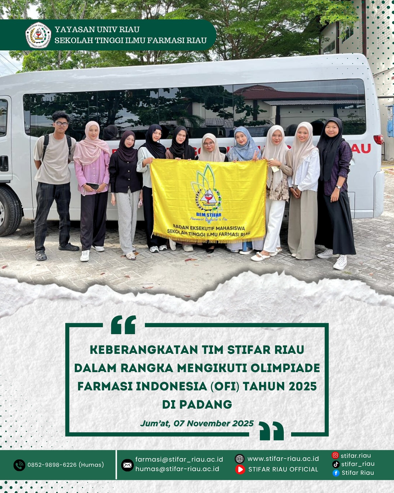 Dari Pekanbaru menuju Padang dengan semangat membara! 🔥 Tim STIFAR Riau siap berjuang dalam Olimpiade Farmasi Indonesia (OFI) 2025 dengan membawa nama baik kampus.