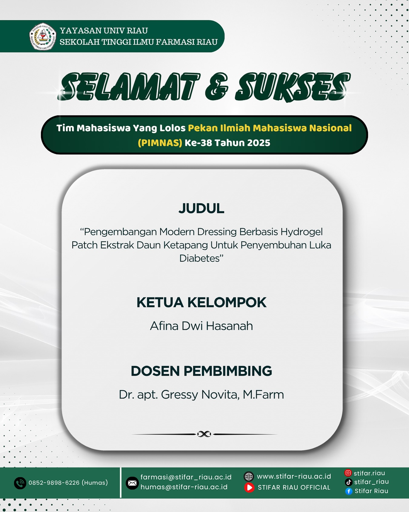 Selamat kepada Afina Dwi Hasanah dan tim mahasiswa STIFAR Riau yang lolos PIMNAS ke-38 Tahun 2025! 🎉
