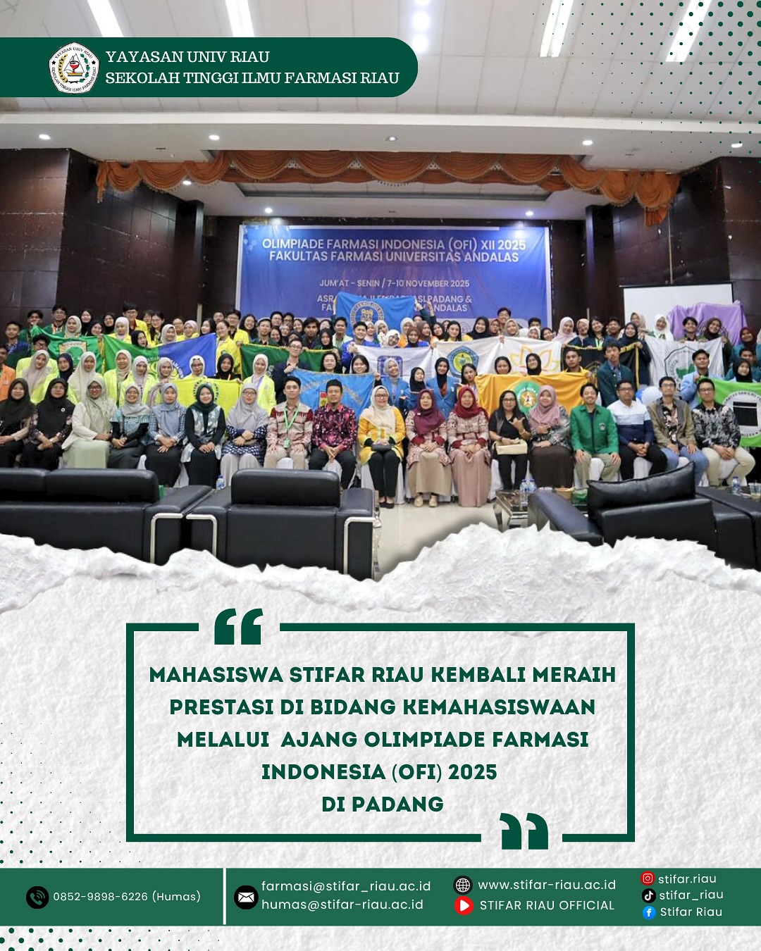 TIM STIFAR Riau berhasil membawa pulang berbagai penghargaan bergengsi. Pada ajang Olimpiade Farmasi Indonesia (OFI) XII 2025 yang diselenggarakan oleh Fakultas Farmasi Universitas Andalas