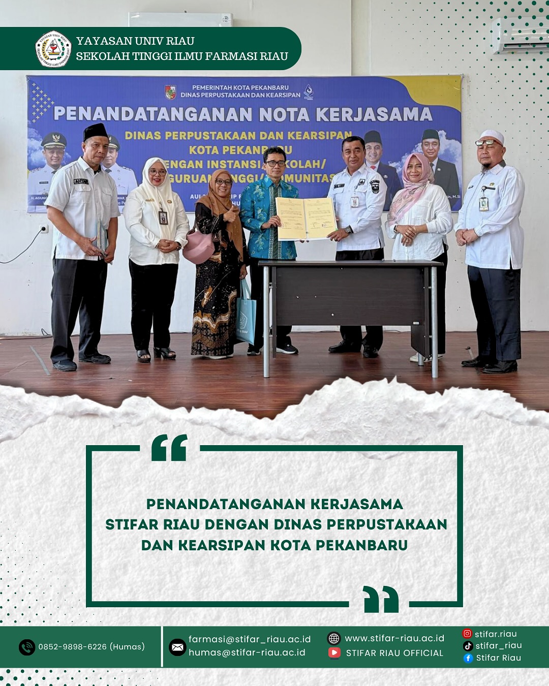 Dalam rangka memperluas jejaring dan memperkuat budaya literasi di lingkungan akademik, Sekolah Tinggi Ilmu Farmasi Riau (STIFAR Riau) menjalin kerjasama dengan Dinas Perpustakaan dan.