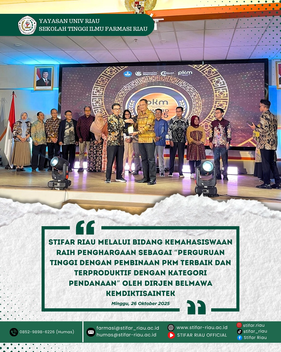 Prestasi membanggakan kembali diraih oleh STIFAR Riau! 🎉 STIFAR Riau melalui bidang Kemahasiswaan menerima penghargaan sebagai“Perguruan Tinggi dengan Pembinaan PKM Terbaik dan Terproduktif dengan.