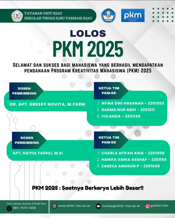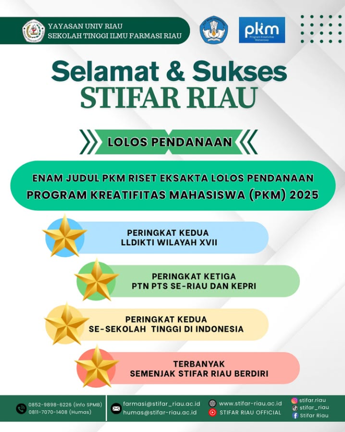 Dengan bangga kami umumkan bahwa enam tim mahasiswa dari Sekolah Tinggi Ilmu Farmasi Riau (STIFAR) berhasil LOLOS pendanaan Program Kreativitas Mahasiswa (PKM) Tahun 2025..