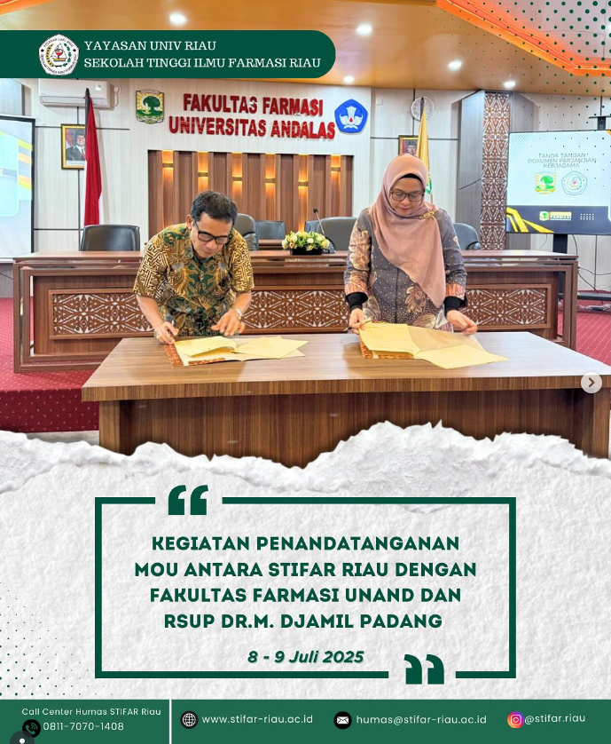 Dalam rangka memperkuat kualitas pendidikan dan praktik kefarmasian, STIFAR Riau resmi menandatangani MoU bersama Fakultas Farmasi Universitas Andalas dan RSUP Dr. M. Djamil Padang.