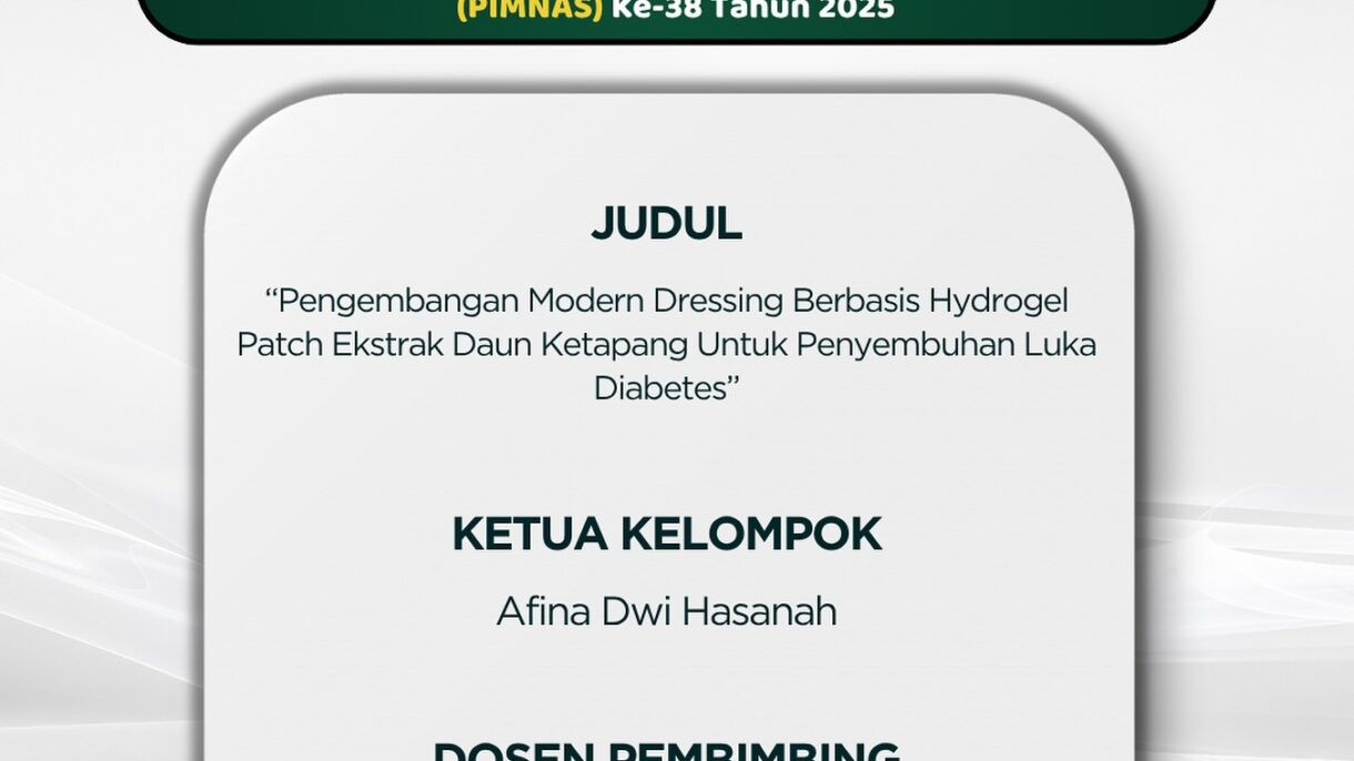 Melalui karya berjudul “Pengembangan Modern Dressing Berbasis Hydrogel Patch Ekstrak Daun Ketapang untuk Penyembuhan Luka Diabetes”, mahasiswa STIFAR kembali membuktikan kepedulian terhadap kesehatan masyarakat melalui penelitian inovatif 🌿💚